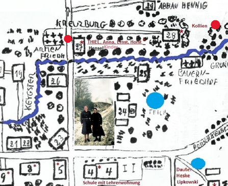 In Schnakeinen angekommen, fanden wir Unterschlupf bei der Familie Samland. Dort waren dann auch Frau Siefert geb. Kuhn mit Tochter und deren Schwester, Frau Marklein geb. Kuhn aus Tiefen thal. Hier erfuhren wir nun, daB noch einige einheimische Familien (d.h. ohne Manner) im Dorf waren. So Frau Veith u. 3 Tochter, Ehe-