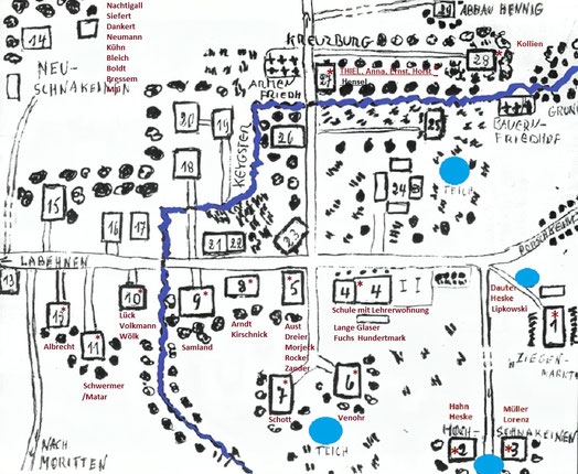 Die Skizze wurde von Elsbeth, geborene Wiechert aus Schnakeinen gezeichnet. Anders als hier dargestellt befand sich das Siedlungsgehöft Neu-Schnakeinen sowie die Gebäude in Hoch-Schnakeinen einige Kilometer vom Ortskern entfernt.