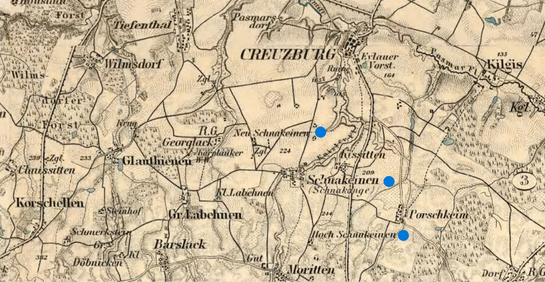Ausgangspunkt der Flucht für Papa, Oma Anna und Sohn Horst war Schnakeinen. Die kleine Gemeinde mit ca. 232 Einwohnern im Jahr 1939, lag rund 1,5 Km von der Stadt Kreuzburg im nördlichen Kreis von Preußisch Eylau entfernt.