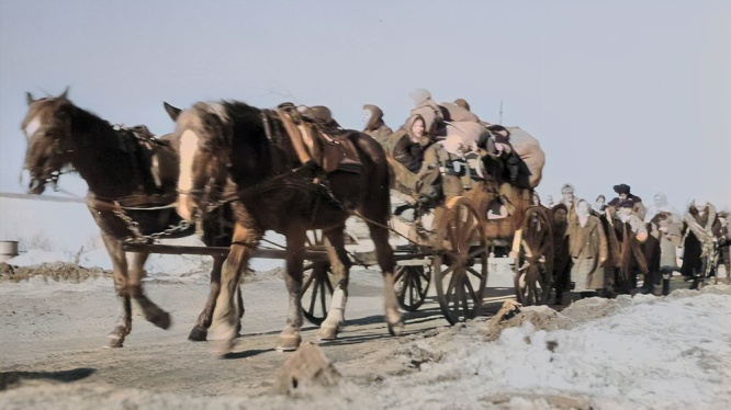 Auch Anna folgte dem. Sie packte ihre Sachen auf ein Pferdefuhrwerk. Es war klirrend kalt bis -25 Grad und eine weiße Eisdecke bedeckte das Land, als sie mit Horst (16) auf den Treck ging.